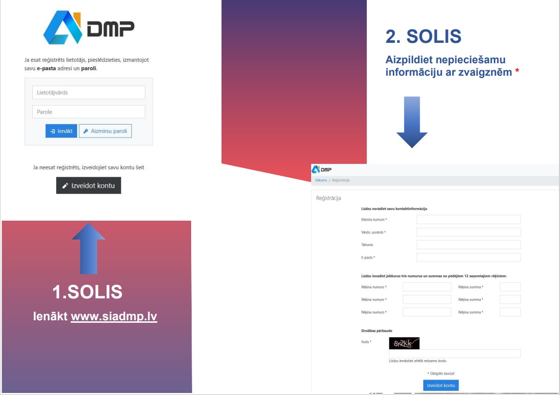 После того, как Вы нажали - Izveidot kontu , Вам на электронную почту придёт письмо со ссылкой, по которой нужно пройти для активизации. После активизации придёт второе письмо с паролем, который Вы вводите на портале клиента www.mans.siadmp.lv . Пароль можно будет поменять на любой другой уже в системе.