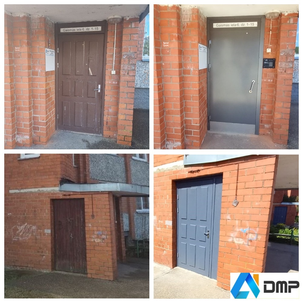 Вслед за тамбурными дверьми в доме по адресу ул. Гайсмас 6 также были установлены металлические утепленные входные двери и кодовые замки. Старые двери были покрашены и поставлены во входы к мусорным контейнерам